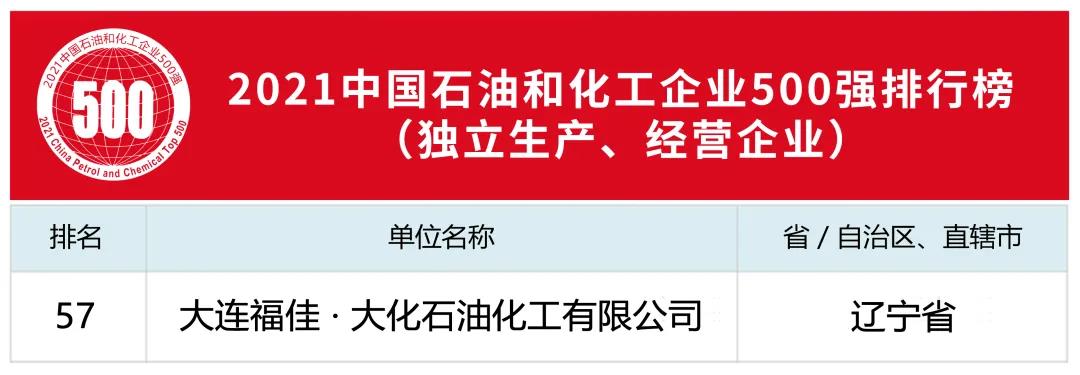 11月29日,2021中国石油和化工企业500强发布会暨双循环新格局下石油化工大企业的机遇与挑战高峰论坛和大连市石化产业推介会网络视频会议在线上举行。福佳集团荣获2021中国石油和化工企业500强排行榜综合类企业第40位,大连福佳•大化石油化工有限公司荣获独立生产、经营企业第57位。