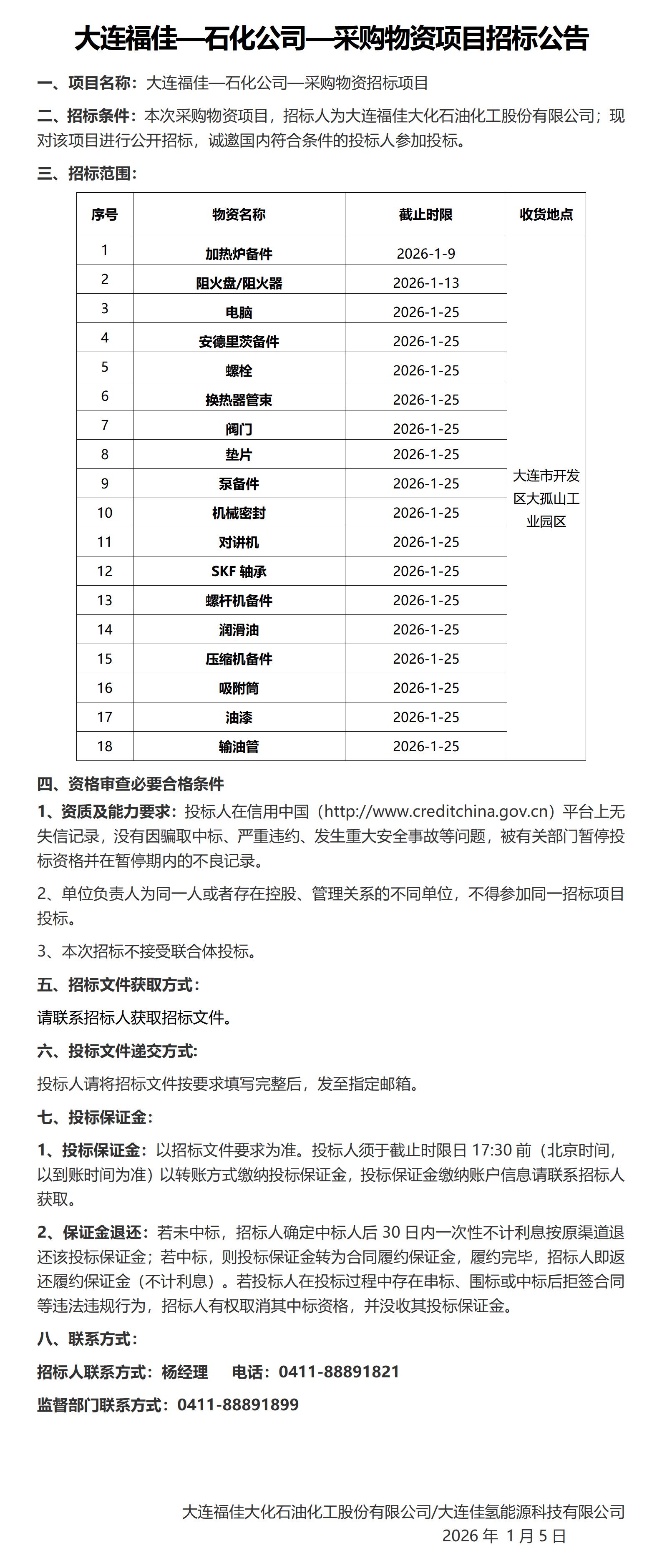 大连福佳大化石油化工股份有限公司—1月采购物资项目招标公告